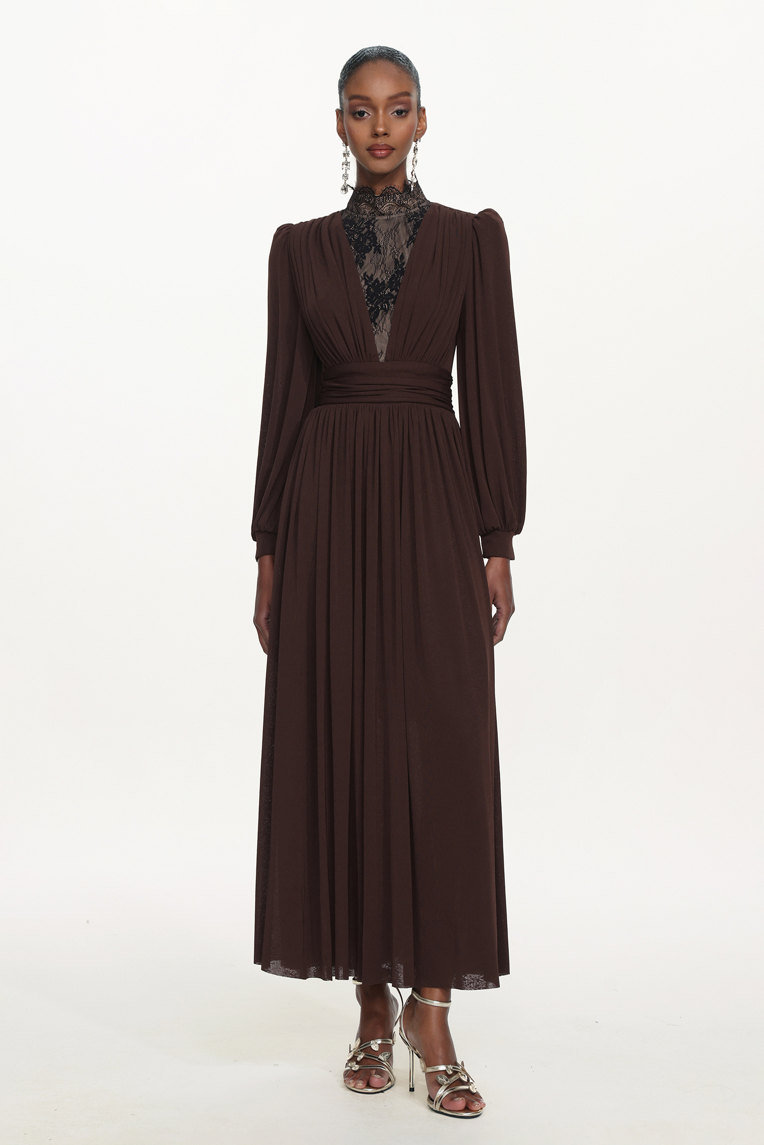 Laila Elegant Contour Long Sleeve Lace Panel Pleated Maxi Dress