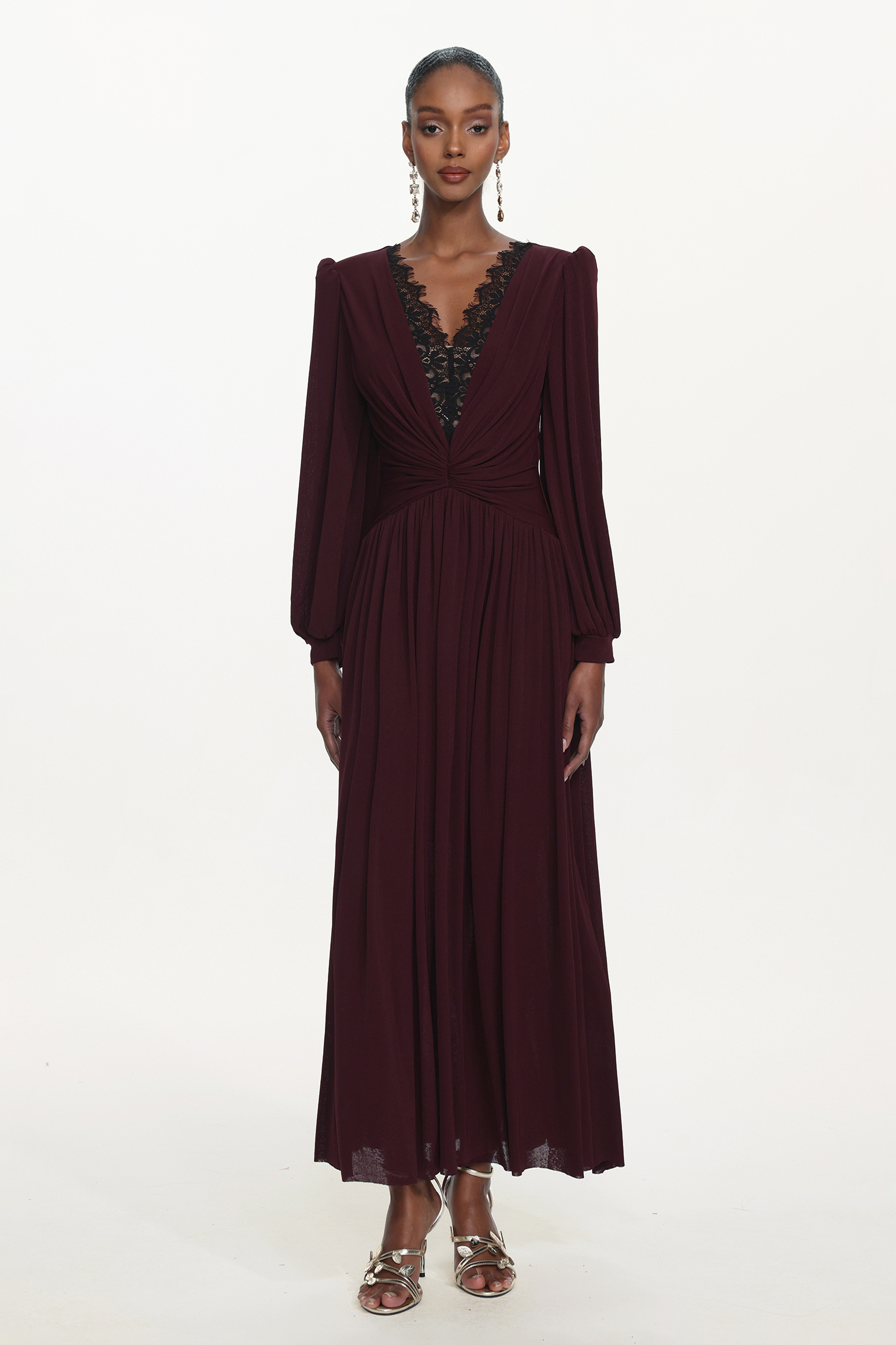 Liaco Elegant Contour V Neck Long Sleeve Ruched Lace Knit Wine Maxi Dress