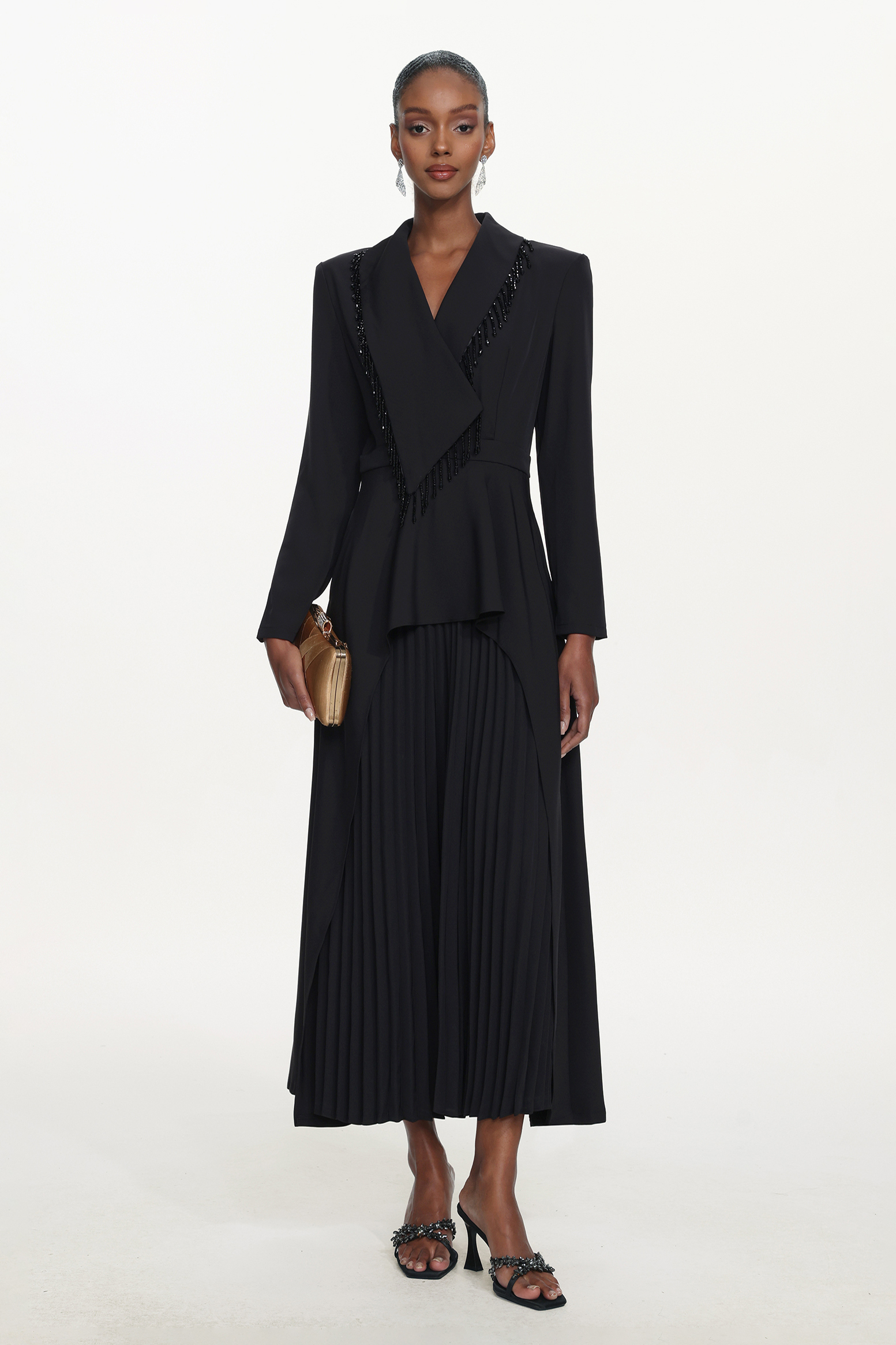 Edwina Elegant Tailored Long Sleeve Asymmetric Beaded Fringe Pleated Maxi Dress
