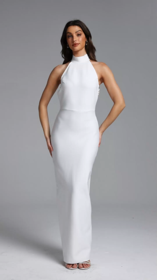 Eanna Romantic Contour Halter Open Back Pearl Chain Bow Maxi Dress