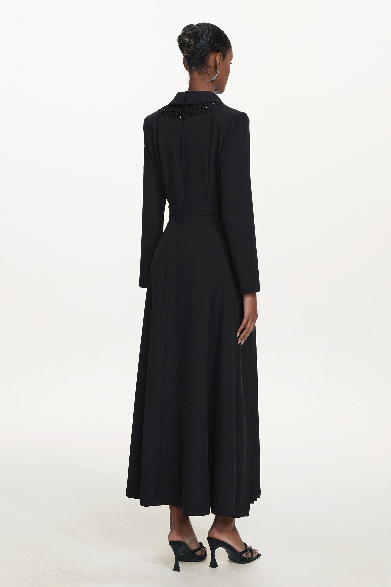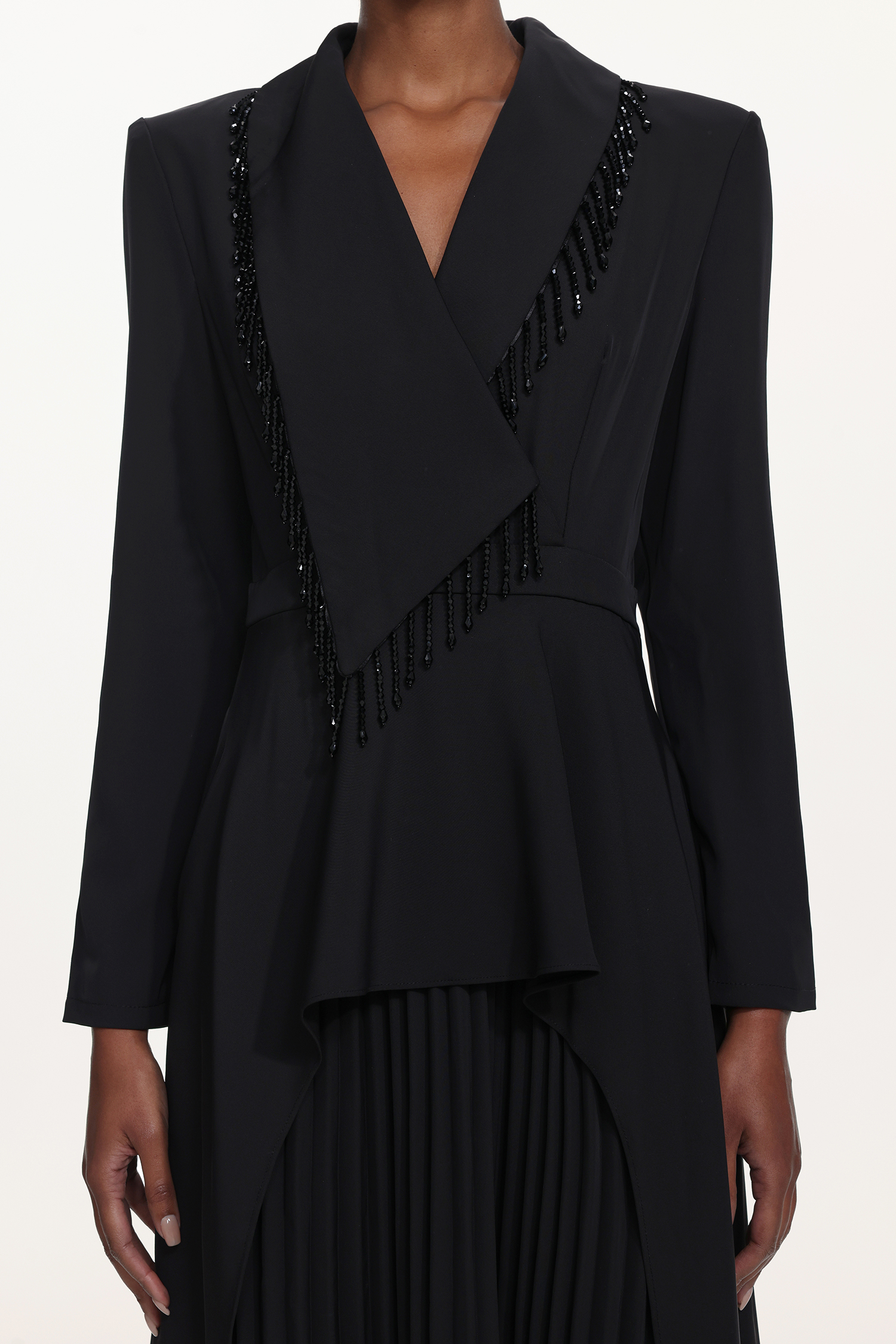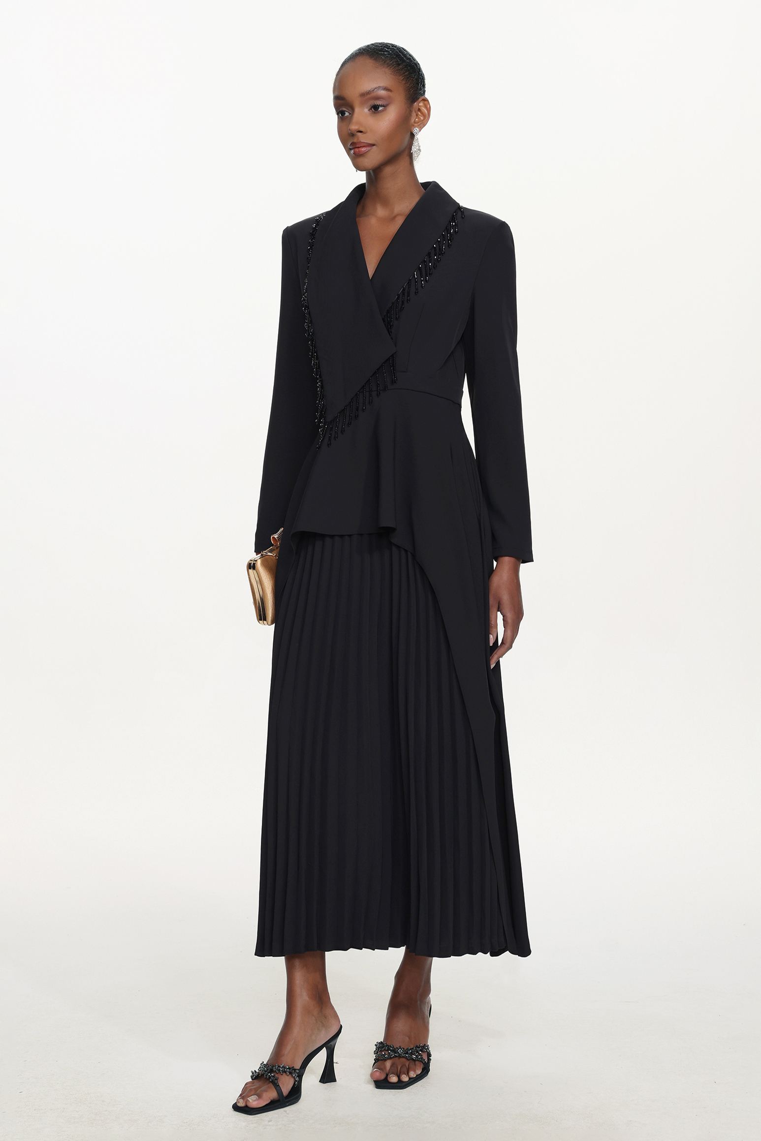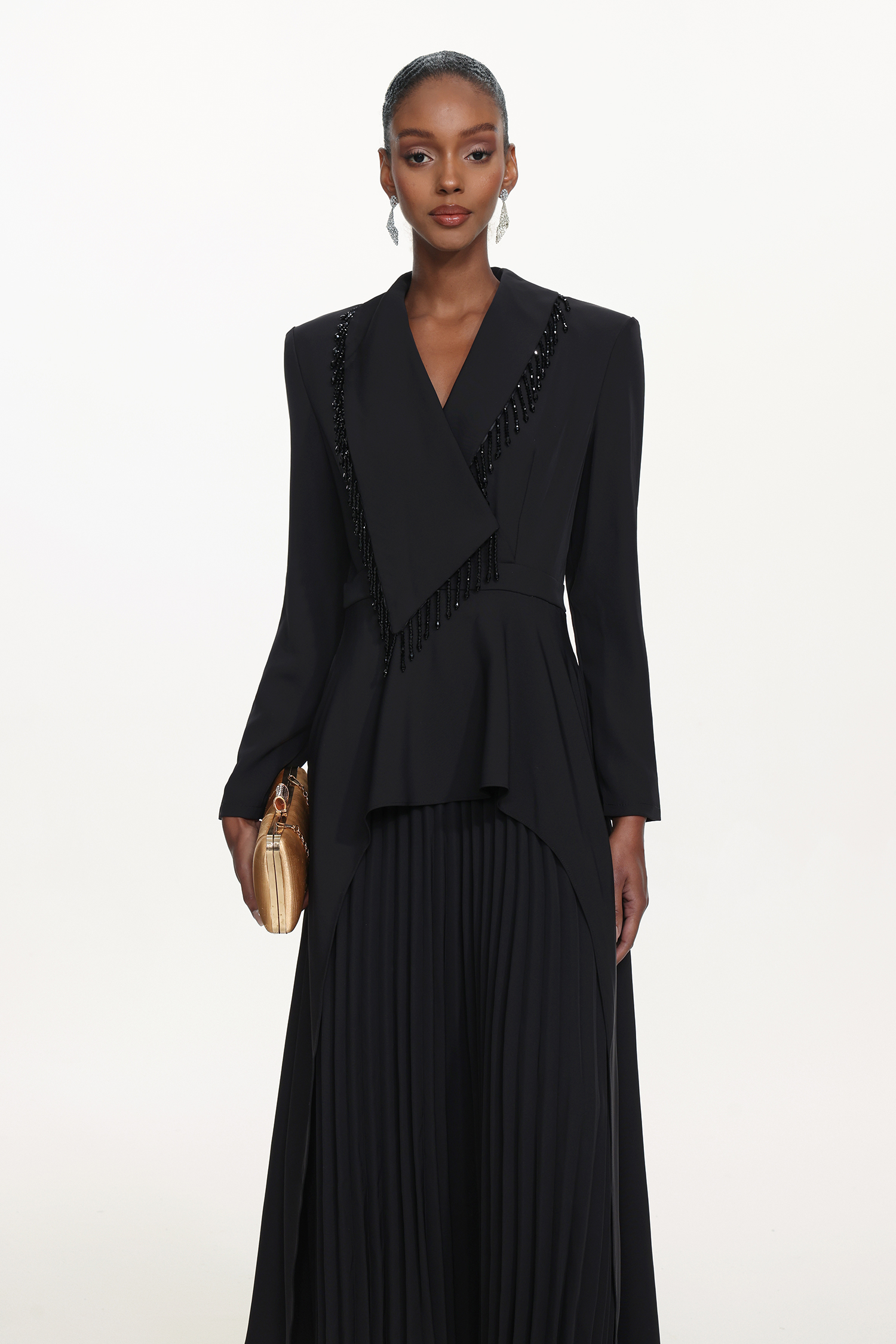 Edwina Elegant Tailored Long Sleeve Asymmetric Beaded Fringe Pleated Maxi Dress