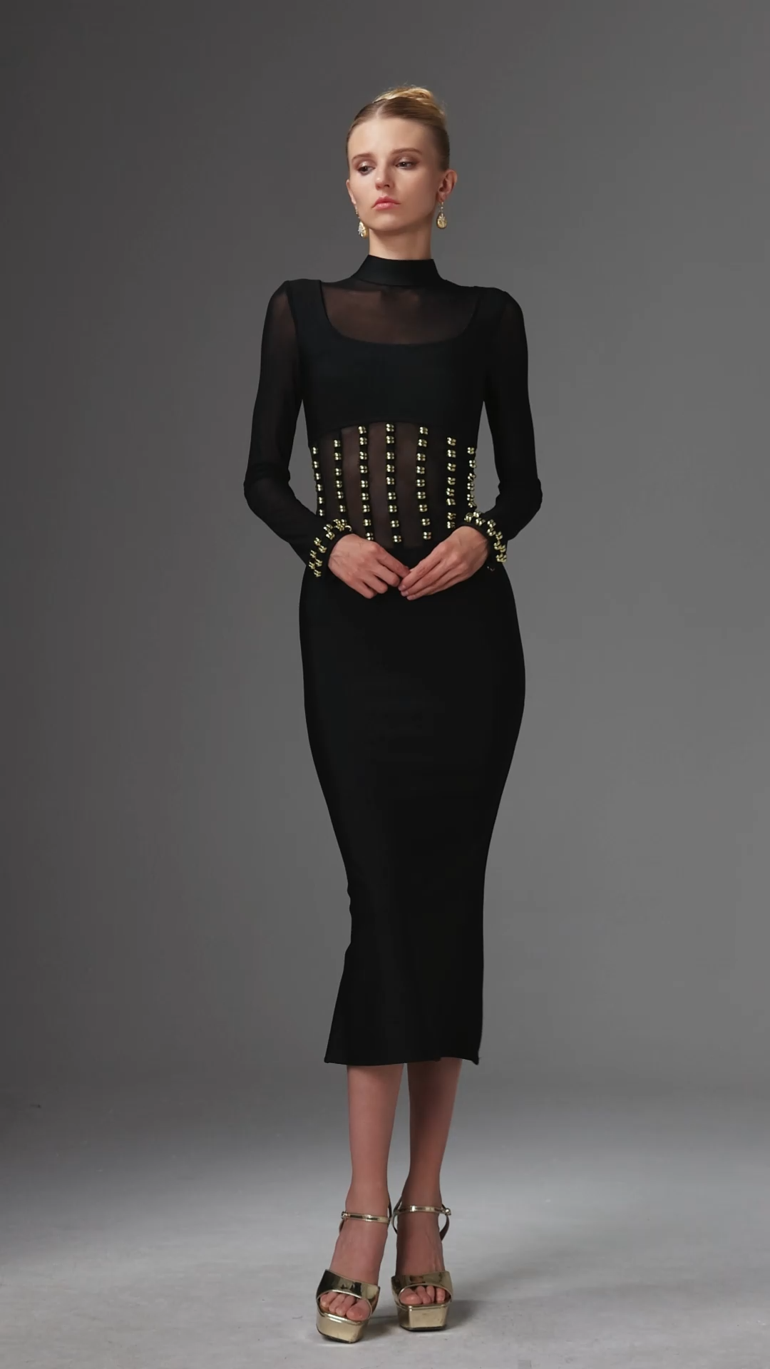 Eirene Sexy Contour Long Sleeve Mesh Bandage Maxi Dress
