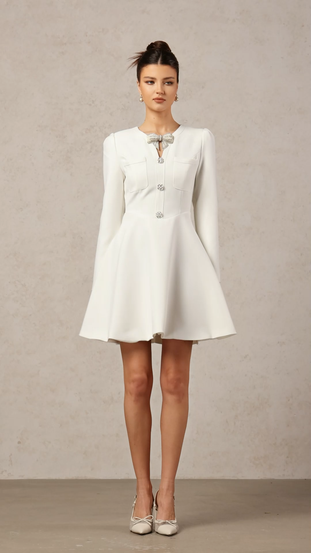 Gacia Elegant Contour Long Sleeve Rhinestone Bow Knit Mini Dress