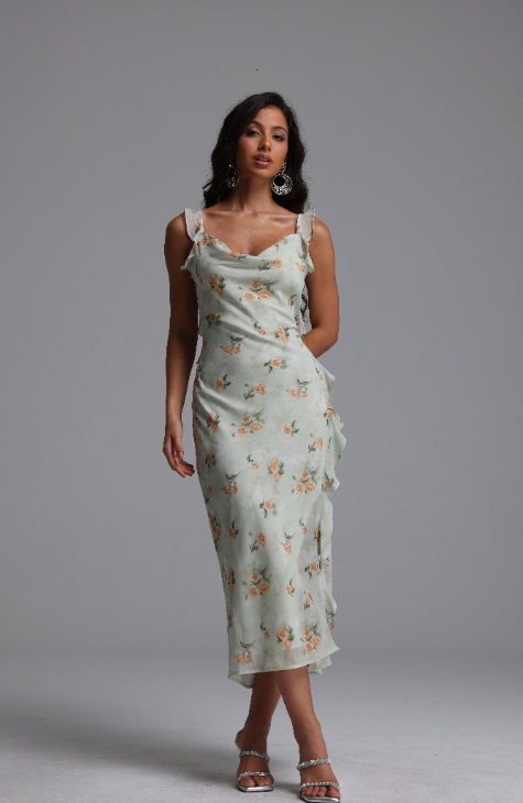 Geraldine Romantic Cinched Sleeveless Ruffle Floral Print Woven Maxi Dress
