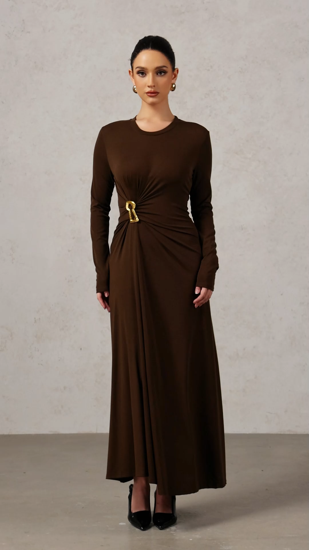 Koko Round Neck Long Sleeves Folds Maxi Dress