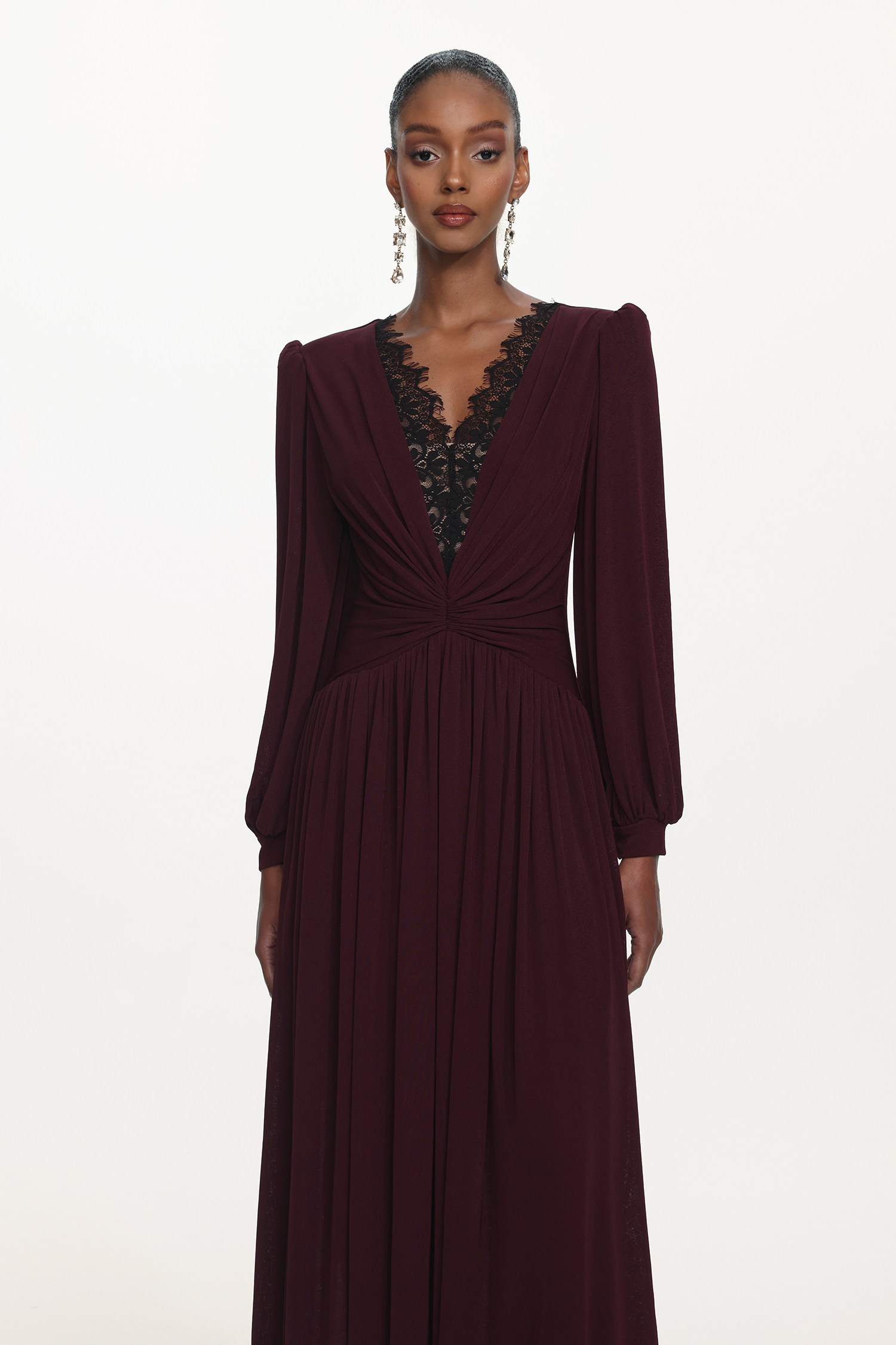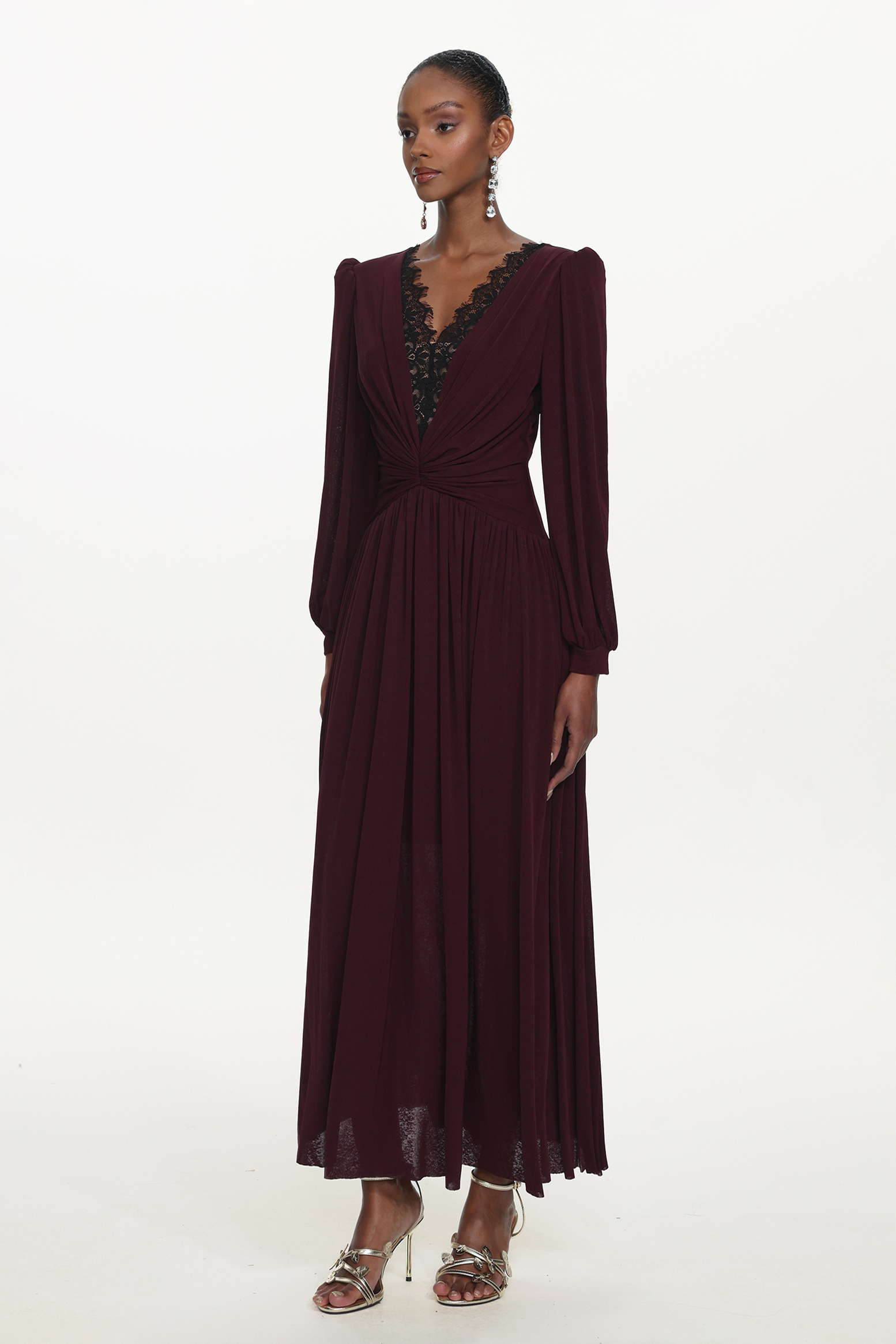 Liaco Elegant Contour V Neck Long Sleeve Ruched Lace Knit Wine Maxi Dress