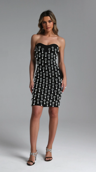 Luda Glamorous Contour Strapless Rhineston Pearl Bandage Mini Dress