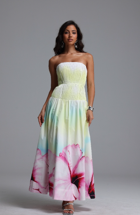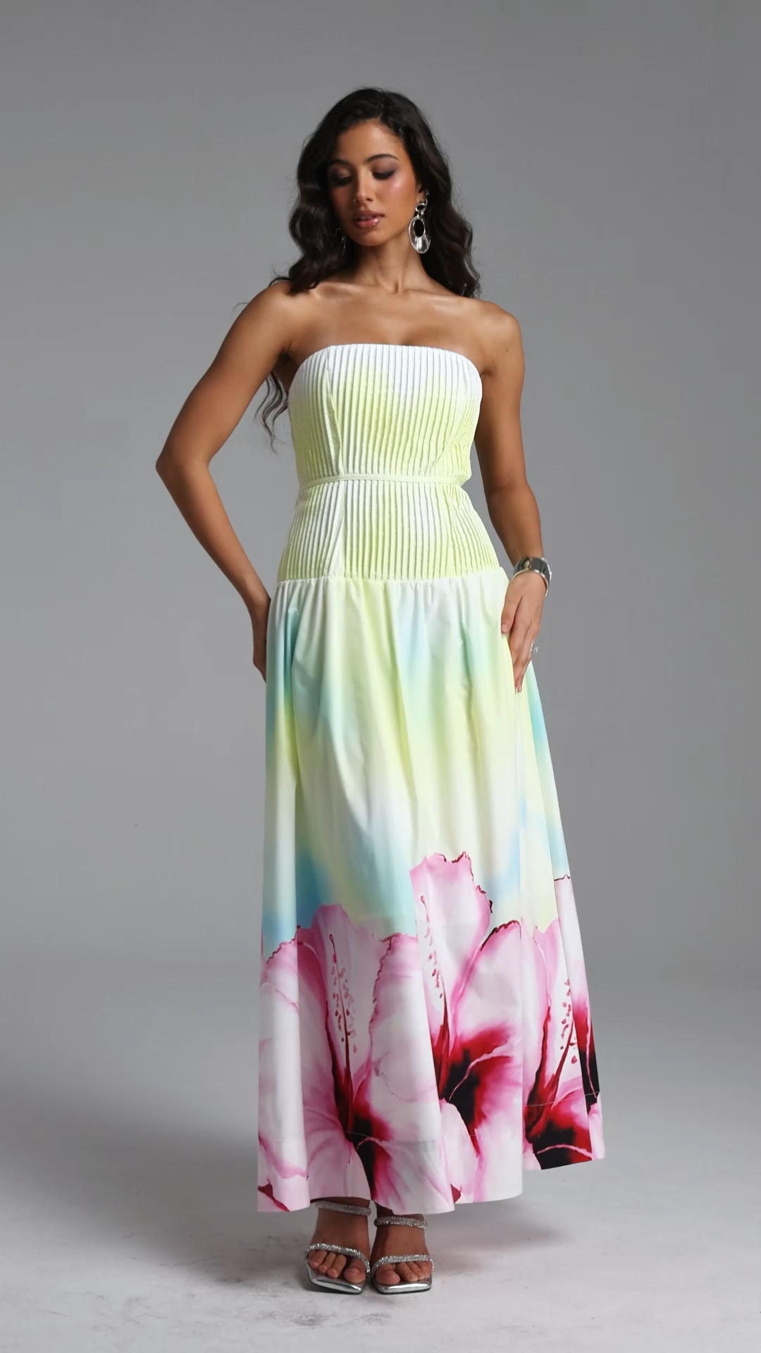 Marge Resort Cinched Sleeveless Floral Print Ruched Woven Maxi Dress