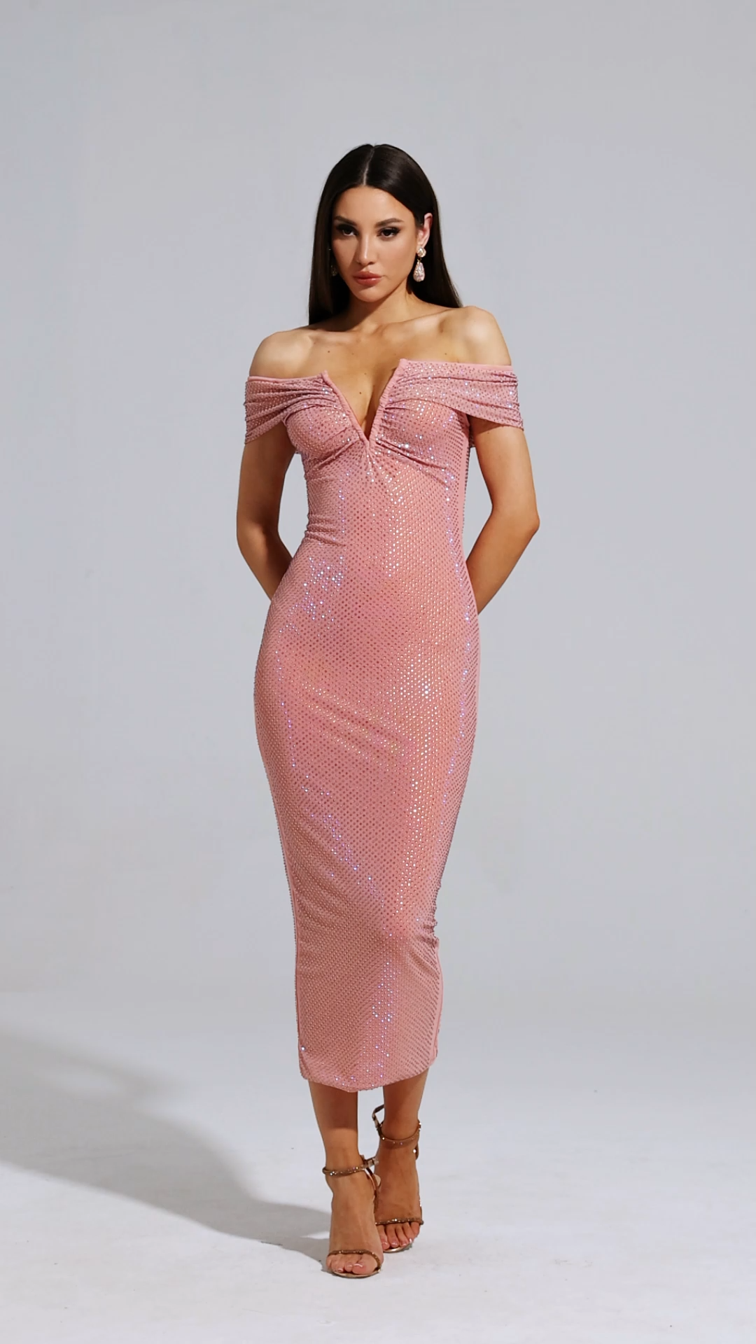 - Elegance redefined in our Fabiola Off Shoulder Midi Dress, perfect for every graceful occasion! This striking dress is a blend of glamour and grace, featuring an off-shoulder neckline and a deep V-cut that exude femininity. The rhinestones add a touch of sparkle to this already elegant piece. Pair it with sleek gold accessories for a refined and sophisticated look.