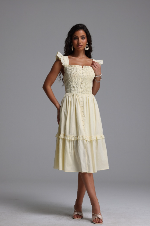 Mila Resort Flowy Sleeveless Ruffle Ruched Woven Midi Dress