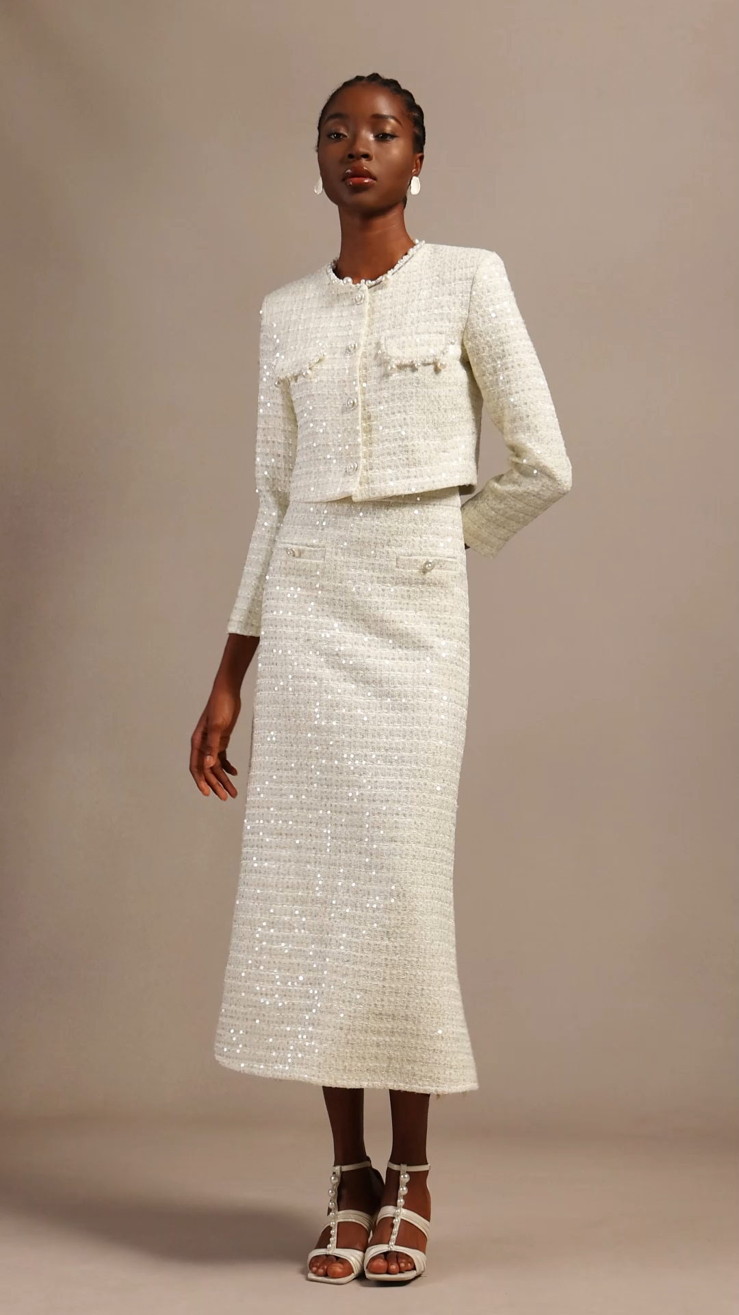 Minon Modern Tailored Long Sleeve Sequin Tweed Top And Skirt Two-Piece Set