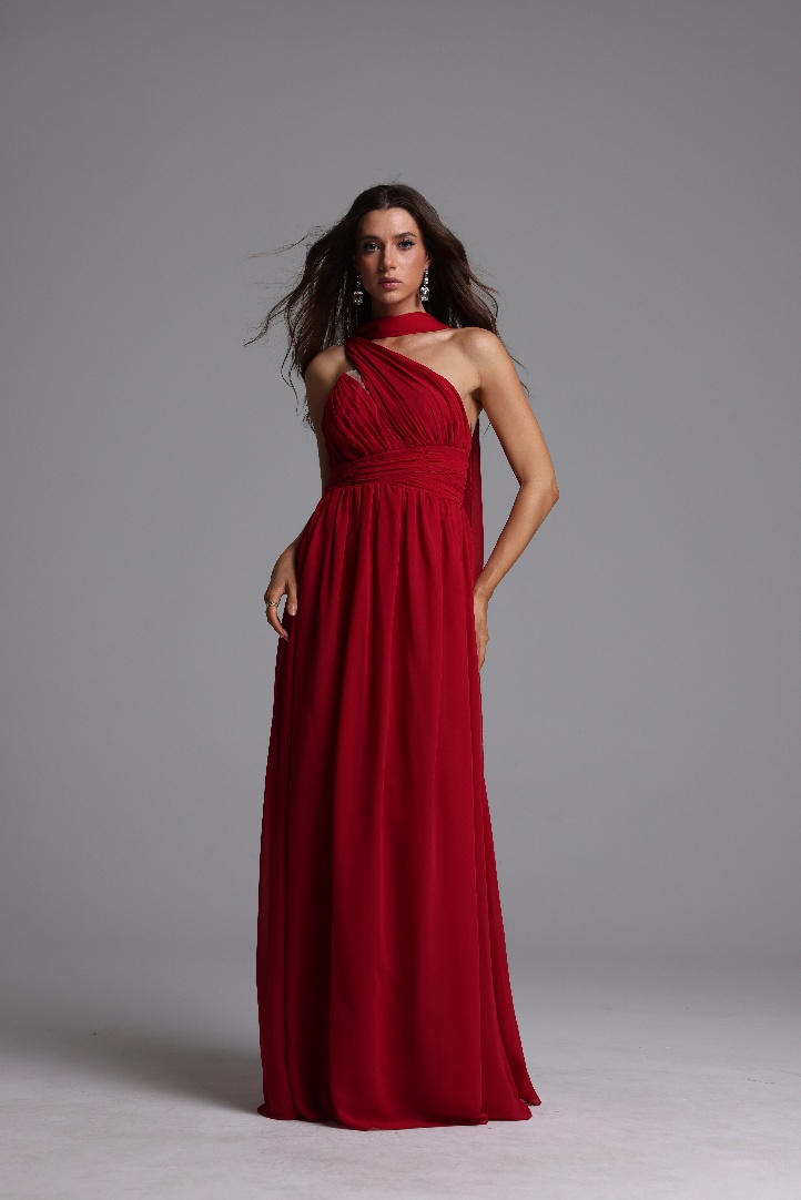 Naida Elegant Flowy One Shoulder Scarf Pleated Maxi Dress