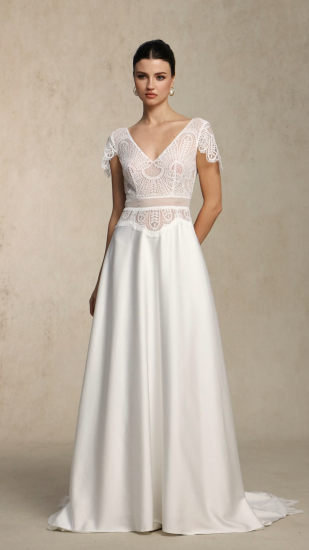 Naira Boho V Neck Cinched Waist White Lace Satin Maxi Wedding Gown