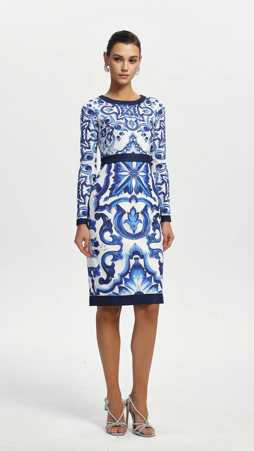 Nerlii Classic Tailored Round Neck Long Sleeve Printed Woven Midi Dress