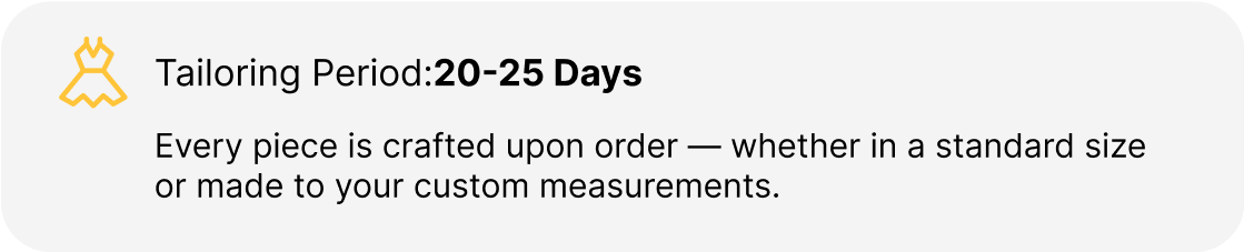 Our bridal dresses are made-to-order, ensuring each piece is crafted with exceptional attention to detail and under perfect conditions. Once you place your order, we will begin the production process, which typically takes 20 to 25 days. We appreciate your patience and can't wait to create a beautiful dress just for you!