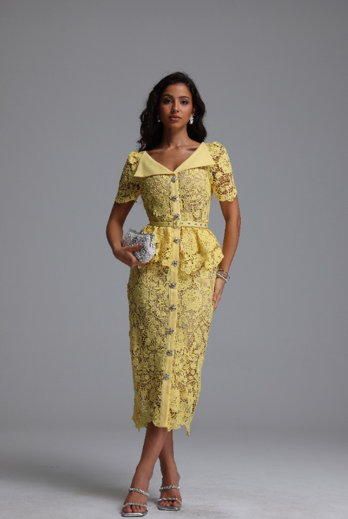 Quinn Elegant Cinched Short Sleeve Floral Lace Maxi Dress