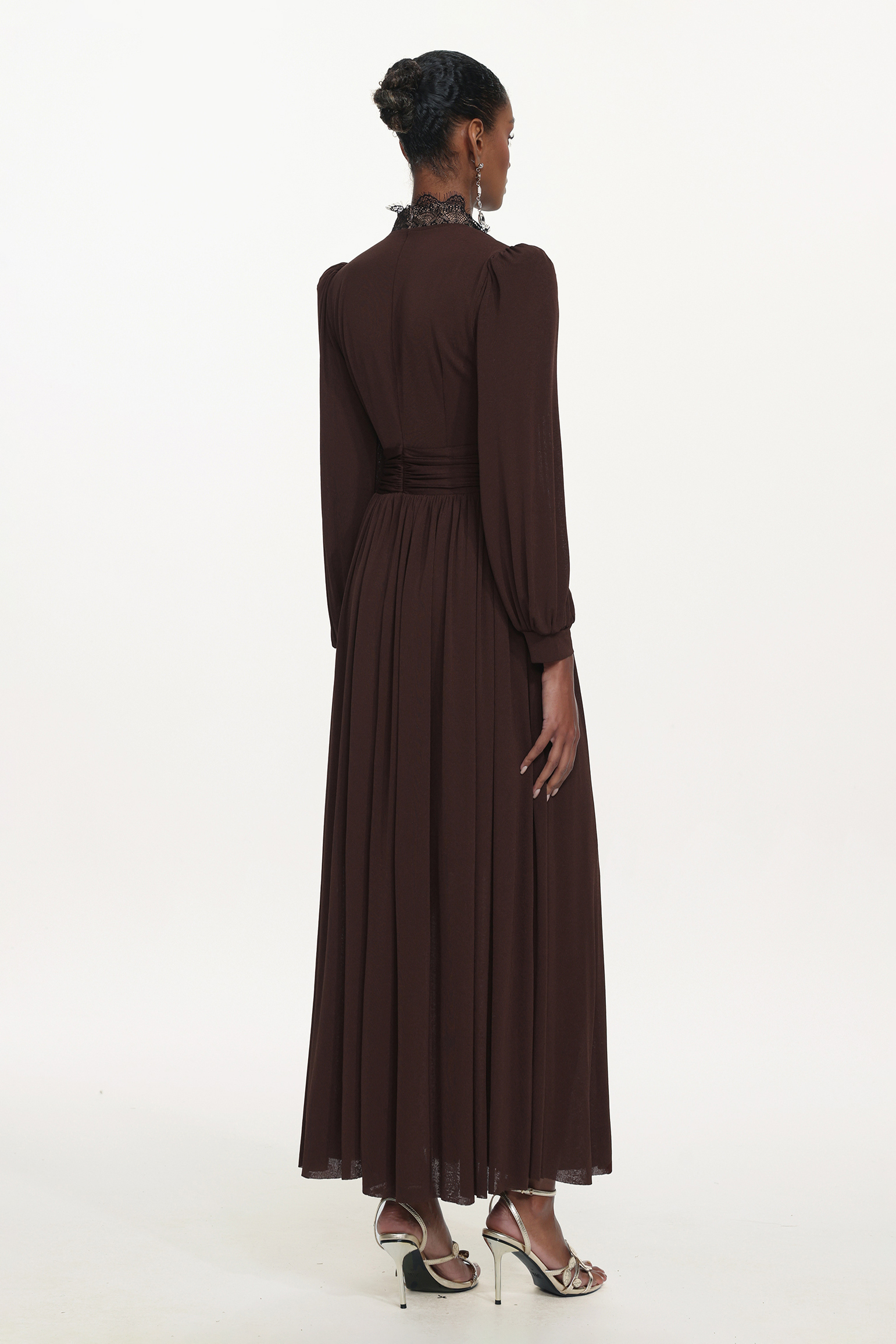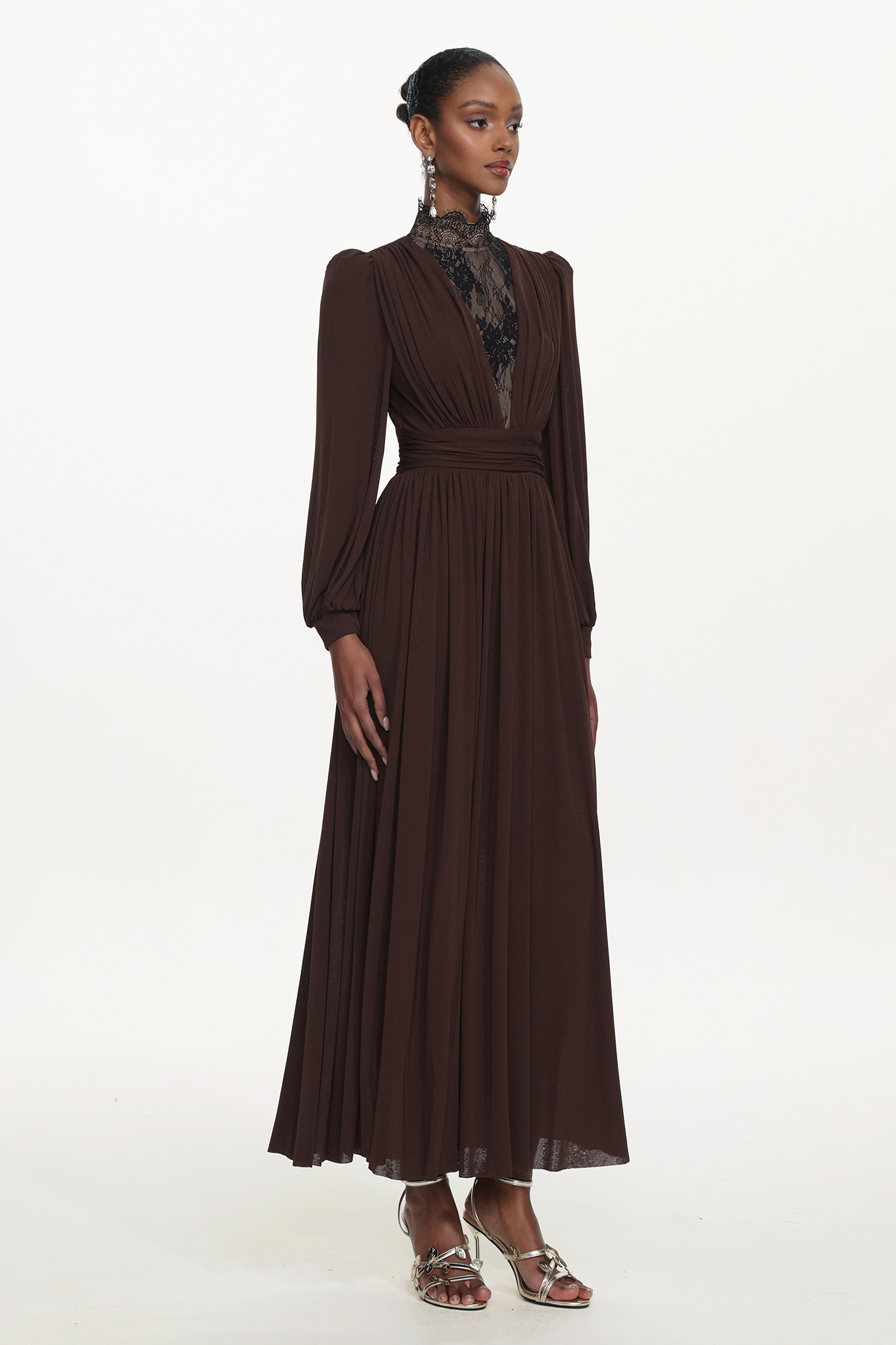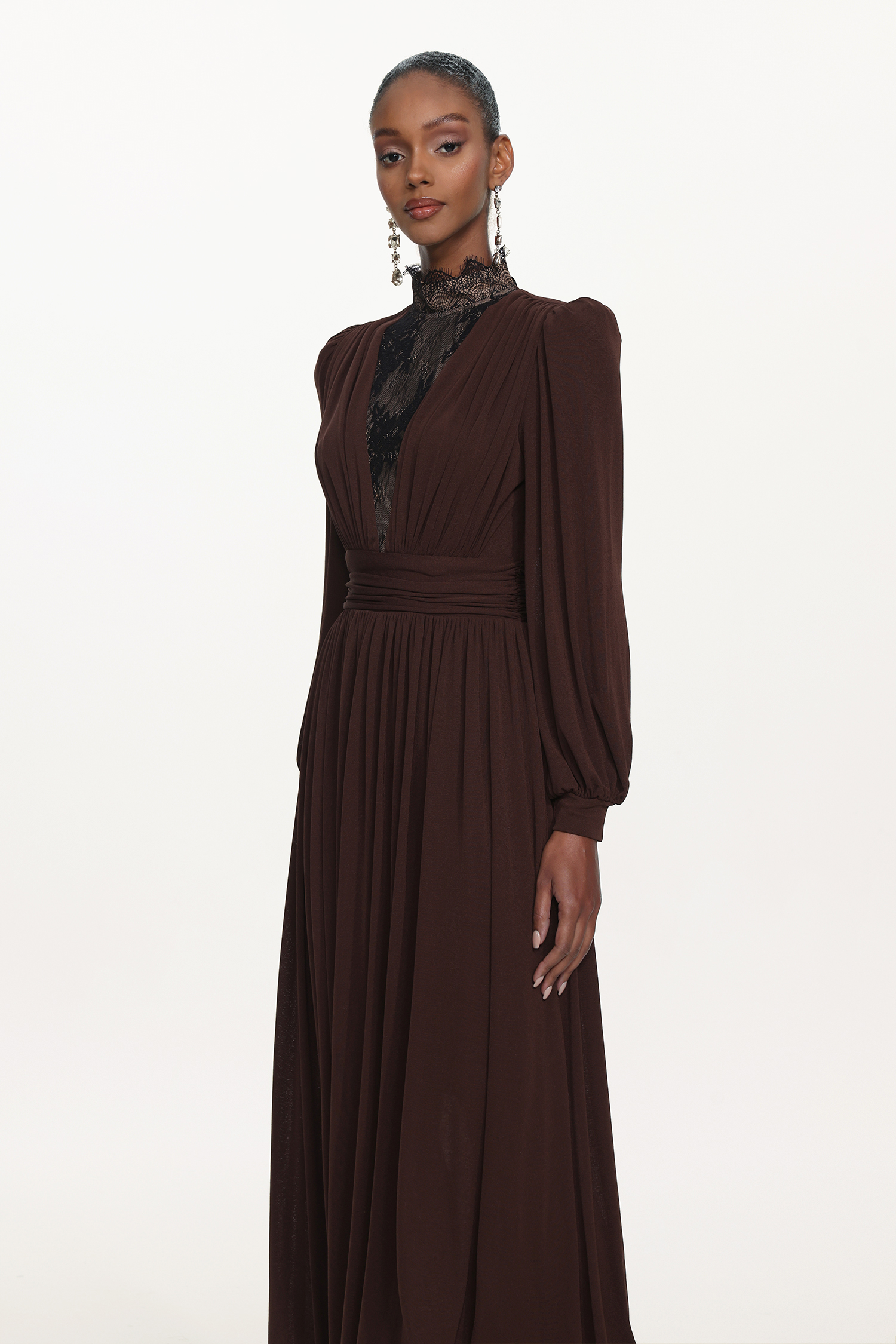Rebecca Chic Contour Long Sleeve Ruched Lace Knit Maxi Dress