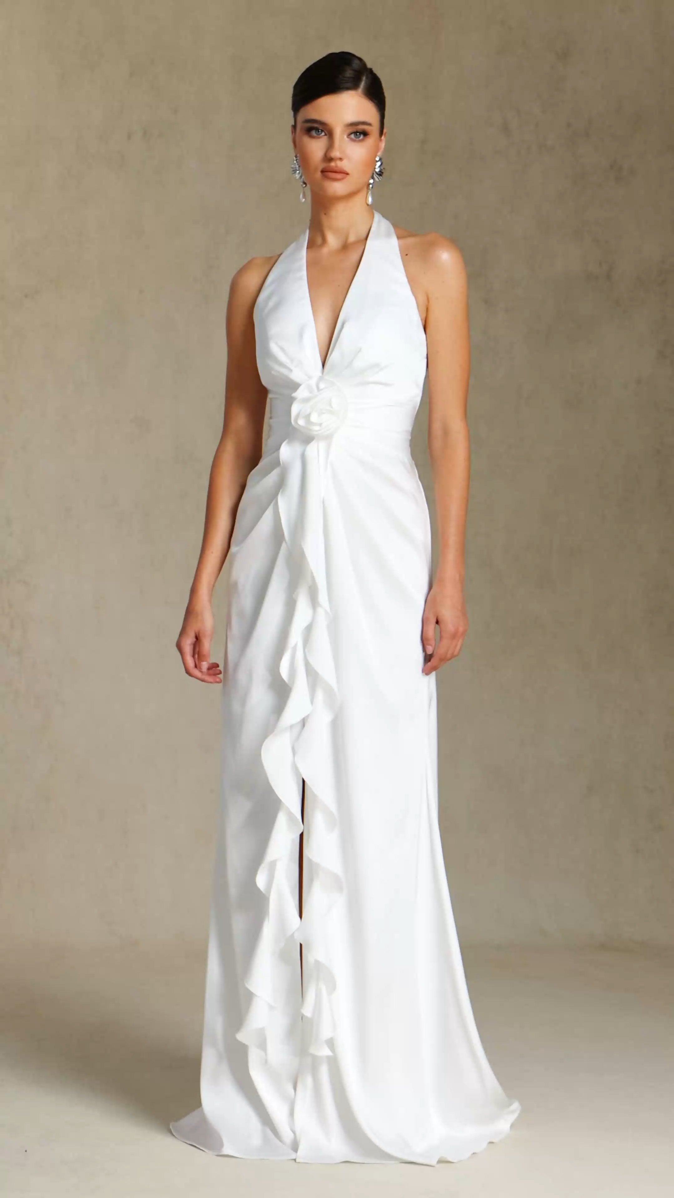 Salla Ruthie Halter-neck three-dimensional flower ruffled cinched waist maxi dress