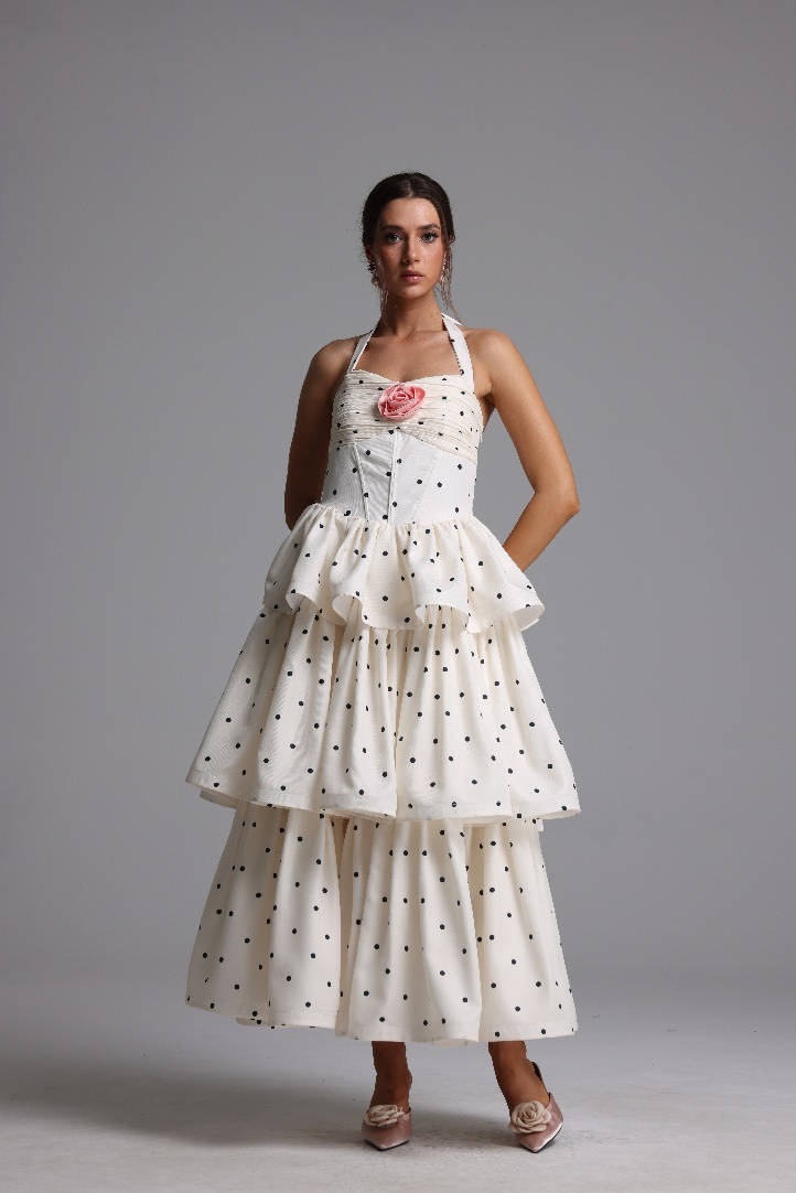 Sarai Romantic Tailored Halter Pleated Tiered Ruffle Polka Dot Maxi Dress