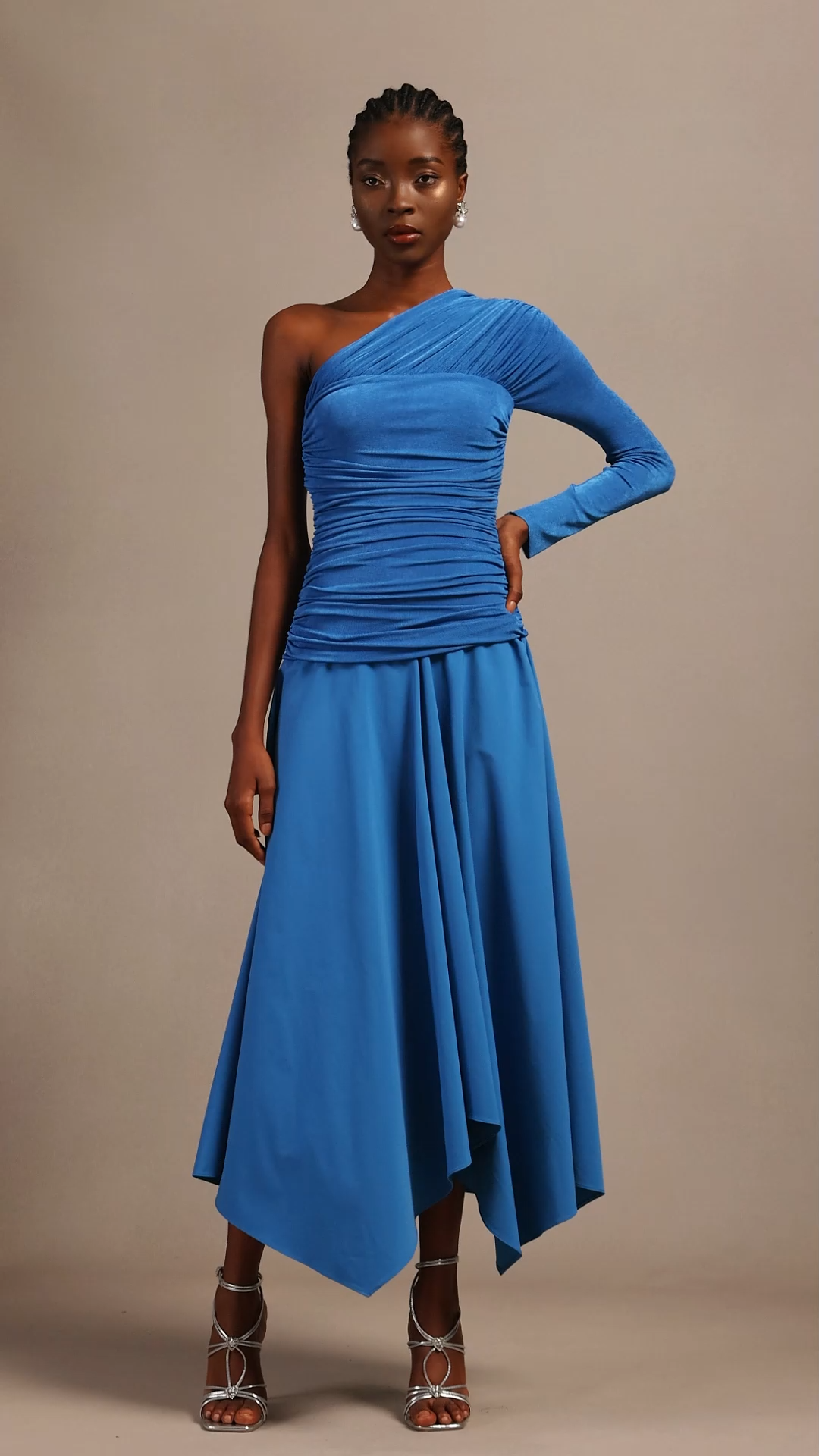 Saturn Resort Contour Ruched Asymmetric Long Sleeve Knit Maxi Dress