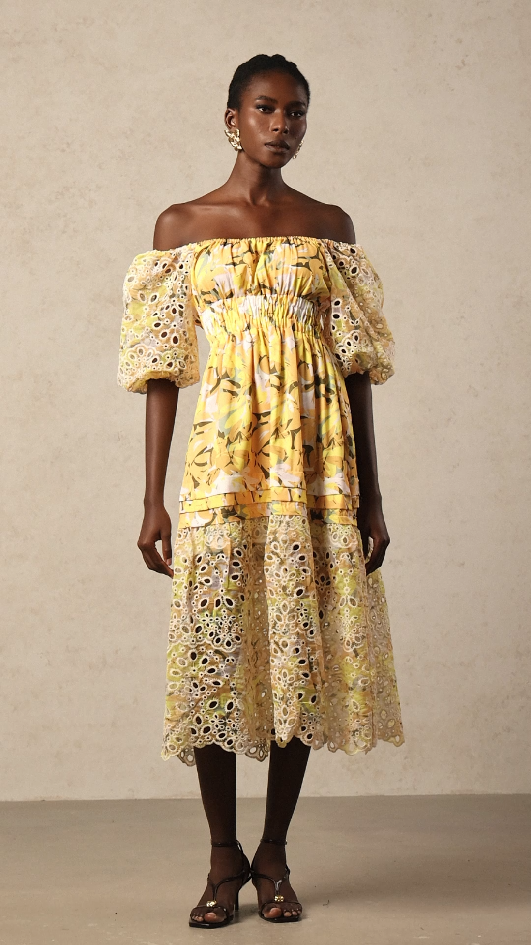 Sissel Puff Sleeves Floral Printed Lace Hollow Out Maxi Dress