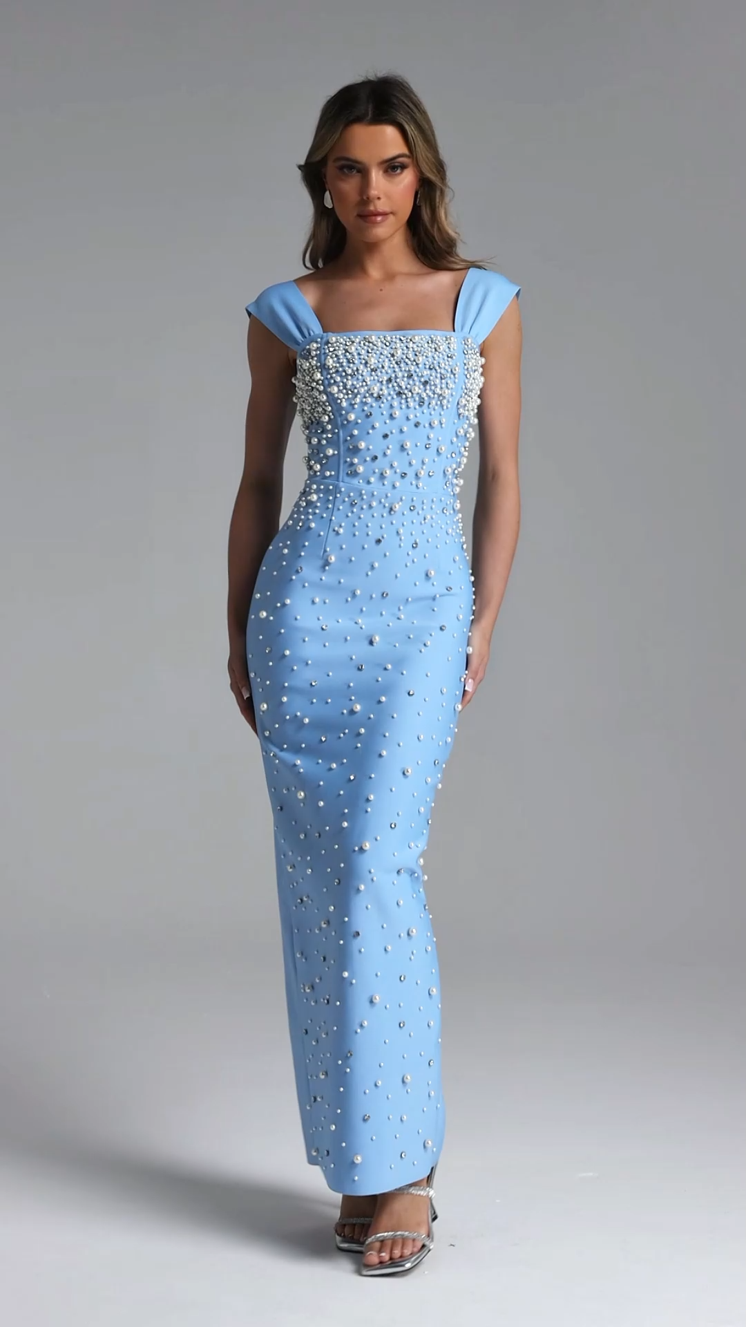 Vafa Glamorous Contour Square Neck Pearl Rhinestone Bandage Maxi Dress