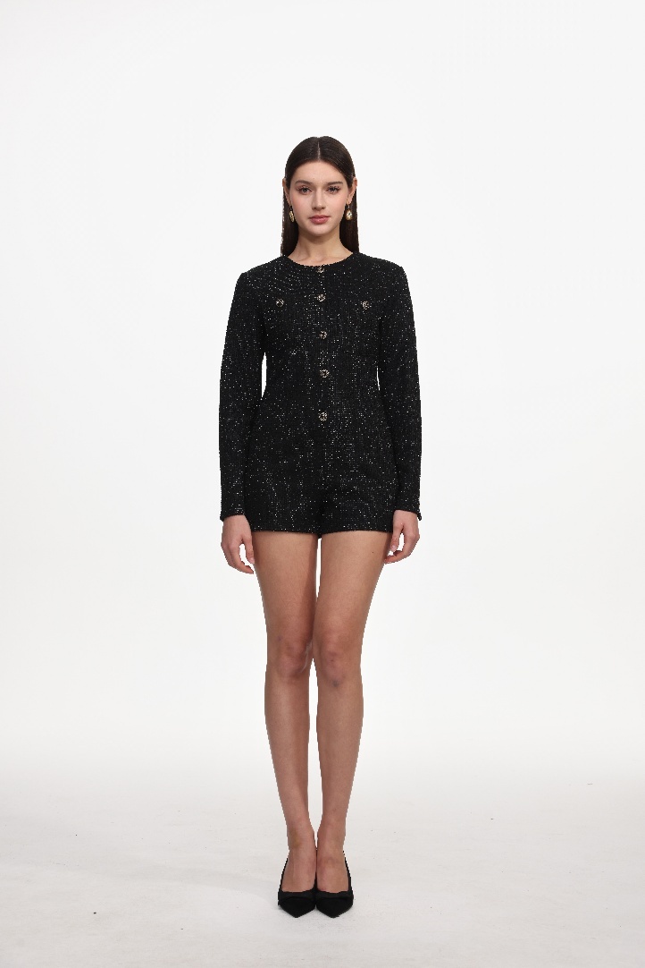 Vedasa Classic Tailored Round Neck Long Sleeve Buttoned Woven Mini Jumpsuit